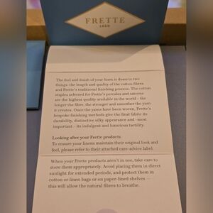 Frette (/frɛˈteɪ/ freh-TAY) is an Italian textile company that manufactures linen. Established in Grenoble, France, in 1860, it was relocated to Concorezzo, Italy, five years later. Their headquarters are currently in Monza, Italy. As of 2023, the company owns and operates over 100 boutiques worldwide. Copyright from Wikpedia Onlin
