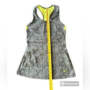 Nike Dry Fit Tank Top Womens Size Medium Trainer Workout top with Reflective Back Gray and Yellow excellent pre owned condition no stains, tears or defects. Athletic wear great for runner. See photos for detail and measurements. V neckline, Racerback tank, Charcoal gray with black geometric pattern and neon yellow back. Cotton polyester spandex blend. Machine wash cold with like colors tumble dry low. Ready to ship from our shop.