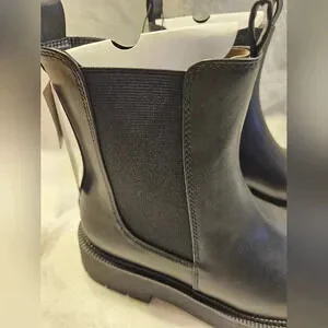 Brand New still in the box made by A New Day all black lady's boot. These boots are easy on and off slip on boots. You can dress them up and wear them to work or dress them down and wear them with jeans to the mall shopping. They are all black in color . These boots are leather and have a round front the souls are black as well with bark stitching. Theses boots fit ture to size in women's.