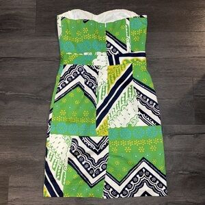 Trina Turk Strapless Tangier Shamrock Cora Geometric Dress Size 8 Green/Yellow/Navy/White/Blue