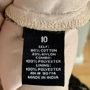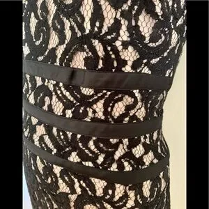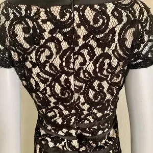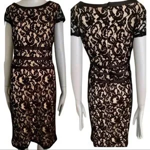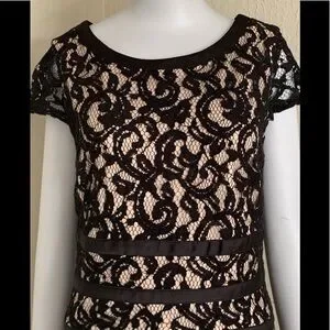 Size 10. The perfect Little Black Dress! Like new condition - clean, steamed & ready & wear! Comfortable and flattering lace dress with some stretch. Cap sleeves. Nude/peachy pink lining that peeks through the lace overlay. 80% Cotton 20% Nylon. Shown modeled on a size 0 mannequin with extra fabric cinched in back – fit may differ. Approximate measurements (taken when laying flat - cannot guarantee fit):
