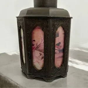 This exquisite antique Chinese Shantou Pewter Tea Caddy dates back to the early 1900s and features stunning reverse painted glass panels. Made of pewter, the octagonal (8- sided) shape with ornate framed panels around the reversed painted, multi-colored glass scenes showcases the intricate craftsmanship of the era. This item originates from China (1900-1920s), and has the embossed makers mark on the bottom (see last pic). Measuring 7.25” H x 4.25” W x 1.75” diameter spout opening and weighs 3 pounds 3oz. The condition is very nice with no dings in the metal, and no breakage, chips or cracks to the glass. Please review all photos as they are part of the description. This original antique piece is a true gem for collectors and admirers of Asian antiques. Its beautiful design and historical significance make it a must-have for any tea caddy collection.