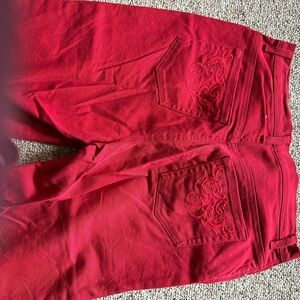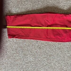 These vibrant crimson red cropped pants from Gloria Vanderbilt offer a relaxed straight-leg fit, perfect for casual outings. Made from a comfortable cotton and spandex fabric, they provide both style and ease for everyday wear. Zip front, front and back pockets.