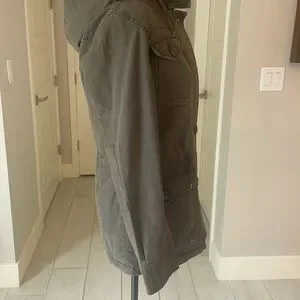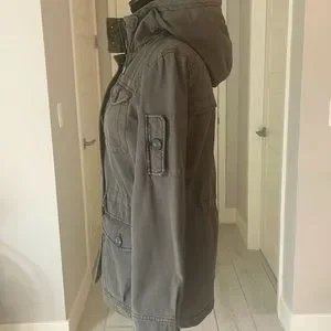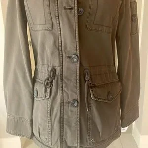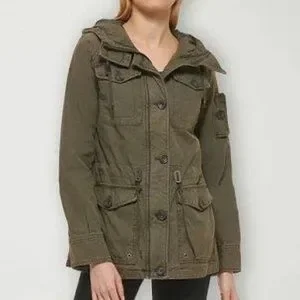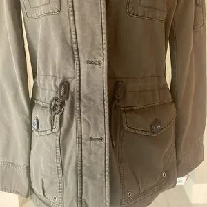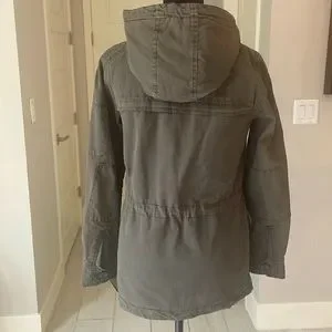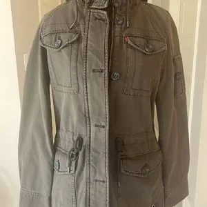 Levi’s hooded military jacket size XS. Levi’s four-pocket military jacket in soft cotton with warm quilted lining. The hooded jacket also features a drawstring waist for cinching for the perfect fit! Army green color some photos look brownish. I wear a size small and this jacket in xs fits me. ***NWT***
