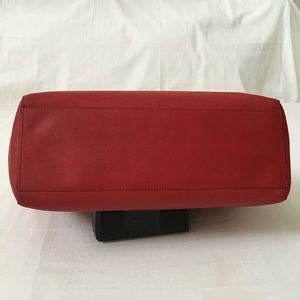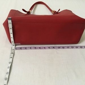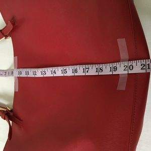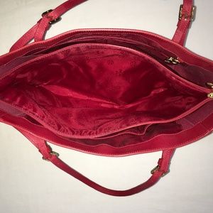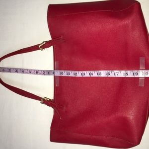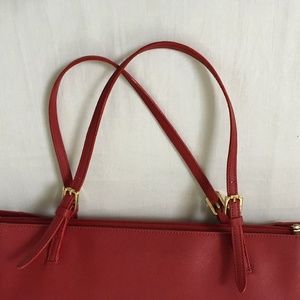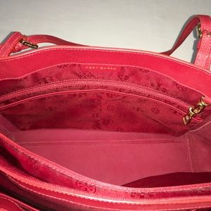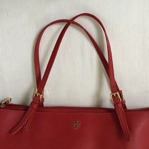 Excellent pre-loved condition. Tory Burch large York tote in red saffiano leather with adjustable buckle straps and center zippered, padded laptop compartment.  I consider this color to be a true primary red, with no orange or pink undertones.  No detectable scuffs or marks to exterior.  Bottom corners show minimal wear, if any.  Inside is very clean with no significant marks or stains.  Please note: Both straps were repaired due to heavy edge fraying and touched up with leather paint. Please zoom in on photos as they are part of the description. Measurements in photos.