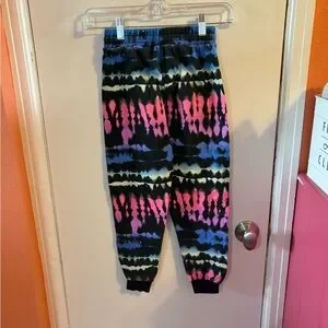 Vibrant tie-dye joggers for kids, featuring a blend of pink, blue, and black. Perfect for a playful and comfortable look.