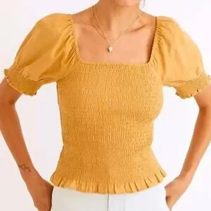 Madewell Lucie Gold Puff-Sleeve Smocked Bodice Top Size Medium NWT