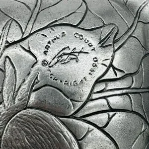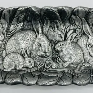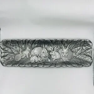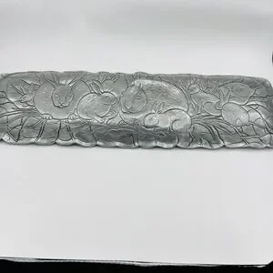 The product is a 1990 Arthur Court Aluminum Bunny Rabbits 19" X 5 5/8" Oblong Serving Tray. This handmade tray features a design of bunny rabbits and is made of aluminum. It was manufactured in the United States by the brand Arthur Court and is not a modified item. The tray serves as a collectible metalware piece that showcases intricate craftsmanship and a charming bunny motif, making it a unique and decorative addition to any serving or display collection.