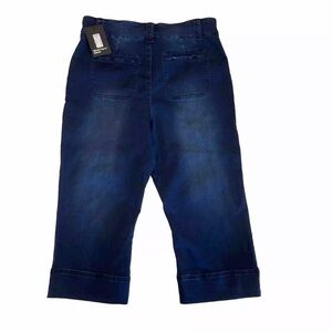 Rekucci Woman’s Secret Figure Denim Pull-On Easy Fit Shaping Jean Cropped Capri is a comfortable and stylish pant designed for women. Made of a blend of rayon, cotton, polyester, and spandex, the capri features a flat front with two buttons that mimic a zippered front. They are mid-rise, comfortable and have slimming and shaping features. The pull-on closure and easy fit make them perfect for travel and casual occasions. The capri comes in blue denim and has a 21-inch inseam. They are a size 16 and machine washable.