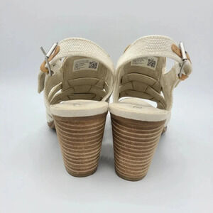Toms Majorca NWOT Woven Leather Suede Canvas Heels Sandals Honey Suede Yarn Dye size 6.5. Woven tan suede with beige canvas. Neutral color palette. Suede footbed. Buckle closure. Stacked block heel. Rubber sole. New without tags; there is a light price sticker imprint on the inside footbed heel as pictured. Heel height is 3 in. Neutral, boho style.