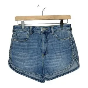 Stylish denim blue shorts perfect for casual outings. Comfortable and trendy, these shorts are a must-have for your wardrobe. light-wash denim with a high-rise fit and a curved hem.
