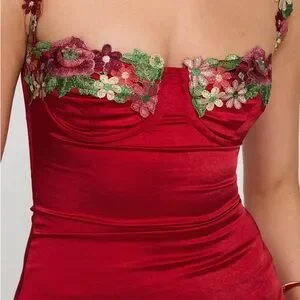 This stunning sleeveless mini dress features a vibrant red hue with a glamorous gold embellished sweetheart neckline. Designed in a bodycon style, it boasts a structured bodice and delicate spaghetti straps, perfect for a cocktail night out.