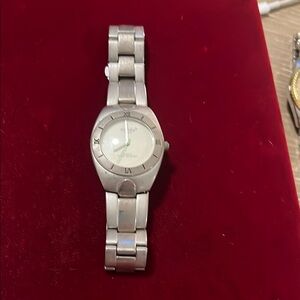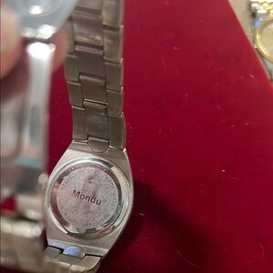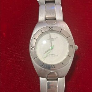 Elegant Mindu silver watch with Roman numerals. Quartz movement and water resistant.