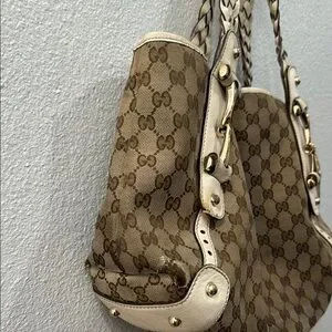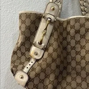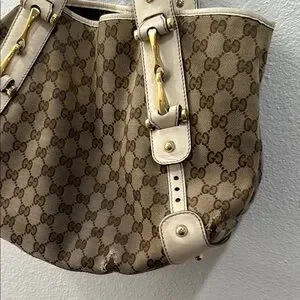 Elevate your style with this Gucci tote bag. Featuring a classic brown and cream design, this bag is perfect for any occasion. The iconic Gucci pattern adds a touch of luxury to your ensemble.