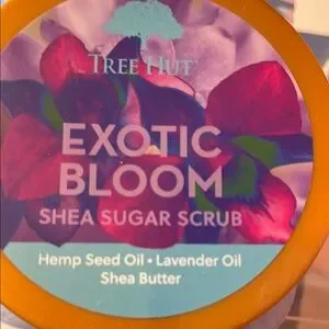 Indulge in the luxurious Exotic Bloom Shea Sugar Scrub. Enriched with hemp seed oil and lavender oil, this purple scrub gently exfoliates and nourishes your skin.