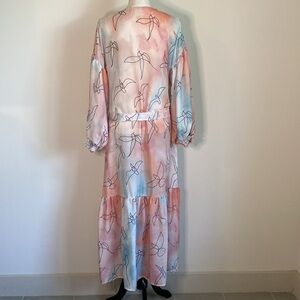 New; never worn; 100% pink/peach/blue/white/black polyester; 53” neck-to-bottom; 116” belt; elastic wrists; 17” flair sleeves; 21.5” pit-to-pit measurement; two belt loops
