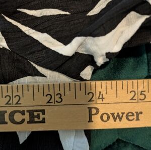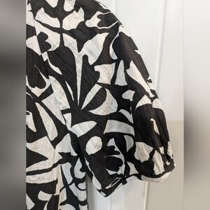 Like new, only worn once! Stylish black and white patterned blouse, loose comfortable fit, can easily be dressed up or down and pairs perfectly with jeans, shorts or a skirt. Has pleating at top of puffy shoulders and at the back of the neck, lightweight but not see through material, and v neck. 24" pit to pit.