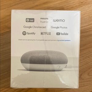 Google Home Mini smart speaker in gray. Compact and stylish design. Unopened and brand new.