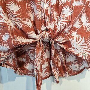 Old Khaki Top Women's 10 Jungle Foliage Button-Up Waist-Tie Orange/White Safari