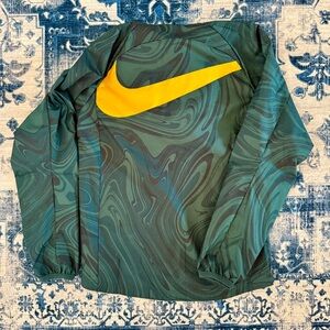 Nike’s official warmup windbreaker soccer jacket made for Football Australia fans and purchased at the 2023 Women’s World Cup in Australia/New Zealand. Loos fit? rain-repellent jacket with hood, classic Nike swish on the back and the Football Australia logo on the left chest. This specific jacket was purchased from a Nike store in Sydney at the WWC. Size is small with a loose, slightly oversized fit.