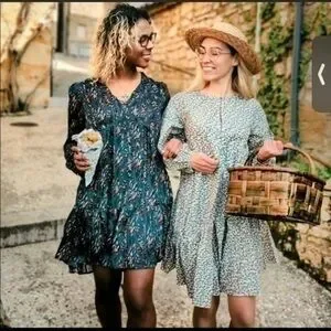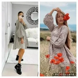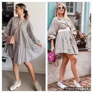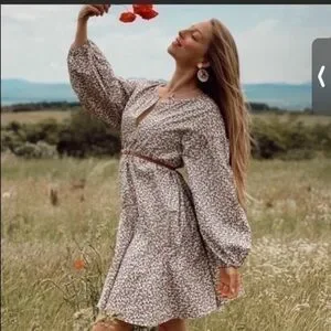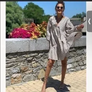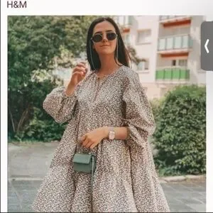H&M Short, A-line dress in crisp, woven organic cotton fabric with a printed pattern. Gathered seam at top and at hips for added volume. Round, gathered