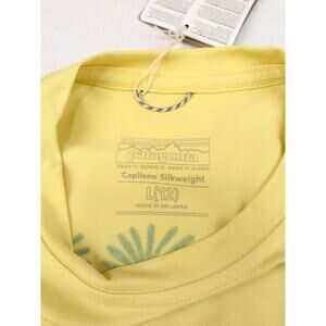Patagonia Youth Long Sleeve Capilene Shirt, color is Mulled Yellow - How to Heal Our Home Planet on the back, size Large (12), new with tags