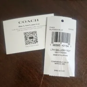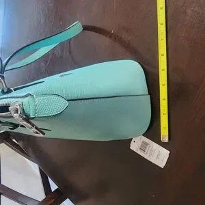 This Coach tote bag (new, never used, tag inside bag) in a refreshing faded blue (Robins egg) hue features classic double handles and silver-tone hardware. Versatile choice for everyday use!