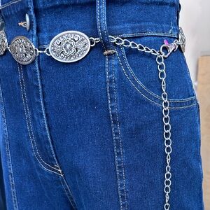 This Western Cowgirls Oval Waist Chain Belt for Women is versatile for any occasion, whether it's a festival, rodeo, or concert. The conchos chain belt pairs beautifully with dresses, coats, sweaters, jeans, leather pants, and even hip skirts and bikinis. It's the ideal accessory for a day at the beach, a party,, or a night out.