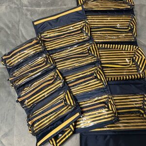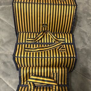 This Joy Mangano three piece beauty case travel bag set features a striking yellow and blue striped design, perfect for making a statement on your journeys. Crafted with durable materials, it ensures longevity and style. Ideal for all your storage and organization travel needs, this bag combines functionality with a vibrant aesthetic. Perfect to store cosmetics or jewelry. Condition- New
