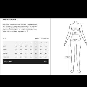 See photos for sizing and measurements, US size 8 UK size 12, subtract .5 inches from front of length. I am 5'5 and wore with 3.5 inch heels and only altered .5 inches from front only.