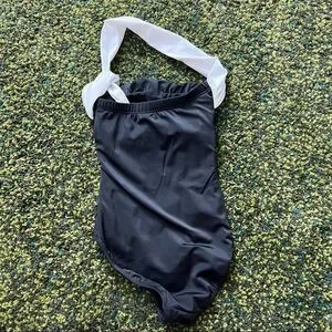 Gently used, minimal signs of wear. Very slimming swim suit with rouched sides.