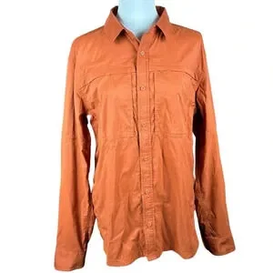REI Co-op Men's orange 'Sahara Solid Long Sleeve Shirt' style button up/down top. Lightweight, moisture wicking material, UPF 30 sun protection. Two front chest pockets with snap closure and sunglass loop. Buttons on the back of sleeves to keep them in place when rolled up, comes with two replacement buttons. Side panels to allow for extra movement, ventilation on back shoulders. Perfect for many outdoor activities, especially hiking and camping, would also be great for traveling. Size men's small.