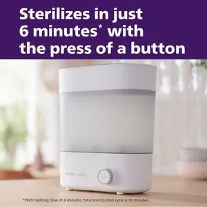 Philips Avent bottle sterilizer in sleek white. Compact and efficient design.