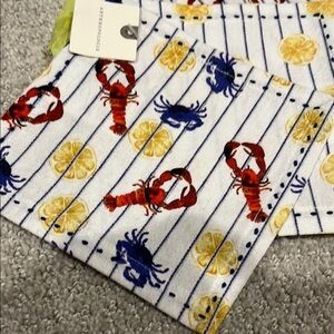 Charming kitchen linens with nautical theme. Features lobsters and lemons. Perfect for adding a coastal touch.