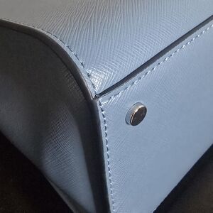 Saffiano leather Two way spade jacquard lining Satchel with zip closure Interior slide pockets Exterior front and back slip pockets