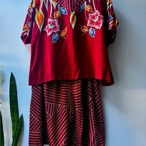 Vibrant red top with floral embroidery. Matching geometric patterned skirt. Perfect for a bold look.