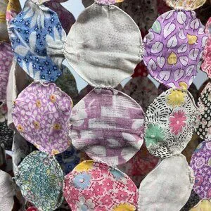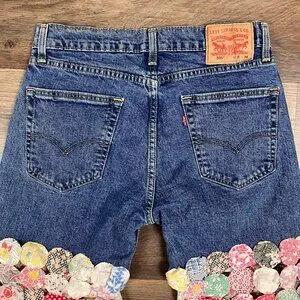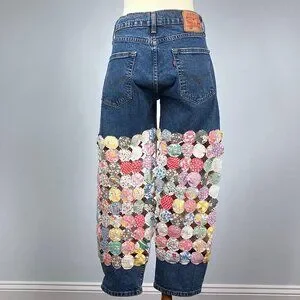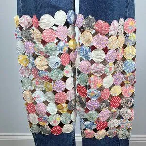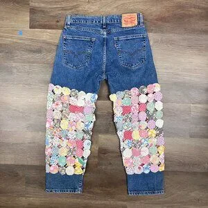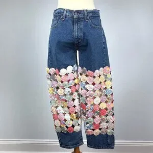 High waisted Levi's 505 straight leg jeans with upcycled vintage Depression-era yoyo quilts. Each pair is hand-done with unique fabrics. No two are the same.
