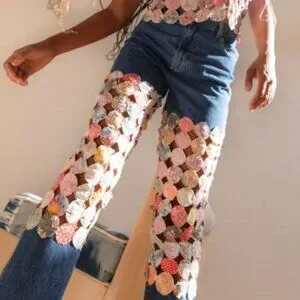 Classic medium to dark wash blue jeans. Colorful shades of pastel for the quilt fabric in bold floral and geometric prints.