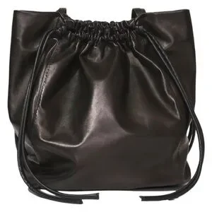 “The Drawstring Bag is crafted in smooth leather to a soft, slouchy silhouette. Stamped with a signature gold foil logo, it features a ruched open top with knotted ties that drape languidly down the sides.