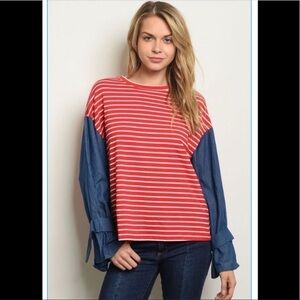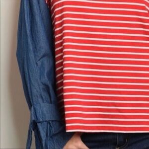 Red & white striped blouse with denim slee…