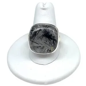 Genuine rutilated quartz (black tourmaline in clear quartz) ring. Size 11. Solid sterling sterling silver and stamped 925.