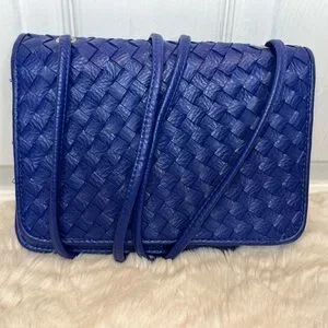 This crossbody bag features a vibrant royal blue color and a unique woven texture, crafted from glossy PU leather for a sophisticated look. Its medium size and thin strap make it a versatile accessory for any occasion, while the rectangular shape with rounded corners adds a touch of elegance.