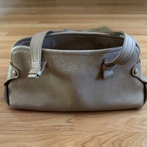 Salvatore Ferragamo Satchel Handbag Camel Light Tan. Made in Italy. AF-21 5766 printed on interior tag. Light tan, pebbled leather. Actual color is lighter than pics, which were taken on a cloudy day. Pictures make bag look like it's a taupe color, but bag is a lighter, camel color. Great color for Spring and Summer. Exterior slip pocket with a 2-snap flap. Pull apart top opening with magnetic closure. Red suede interior zip pocket on one side. Ferragamo branded silver tone zipper pull. Sides and bottom interior fabric appears to be wool. It is pilled on the bottom and side without the zip pocket. No cuts or gouges in the leather; however the color is worn on the corners and top areas of the bag. Please see pics. As with a pair of leather shoes, polish will restore the leather to its natural beauty. One of the handles needs to be reattached, which a shoe repair business should be able to do (see last 2 pics.)