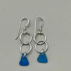 These earrings showcase a modern geometric design with interlocking sterling silver circles and vibrant cobalt blue seaglass. Crafted from polished sterling silver, they feature French hook ear wires for a comfortable fit. The striking contrast between the silver and blue elements makes them a standout accessory.