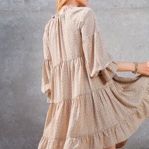 Step out in style with this elegant beige polka dot dress. Perfect for any occasion, this dress offers a flattering fit and timeless design.