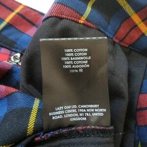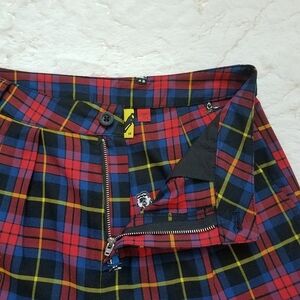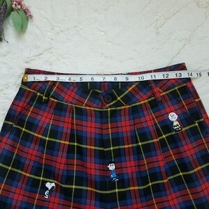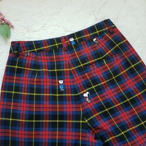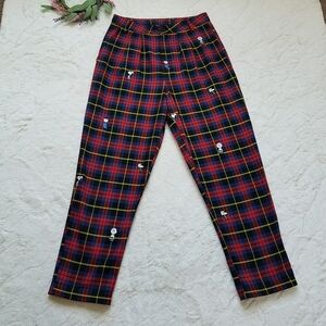 In excellent condition! Plaid, pleated front, snoopy characters embroidered all over, high rise front pockets, one back pocket, belt loops, 100% cotton, no stretch.
