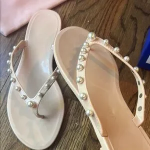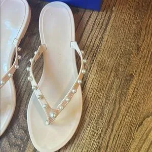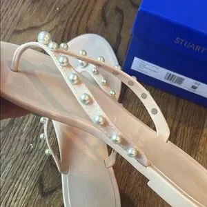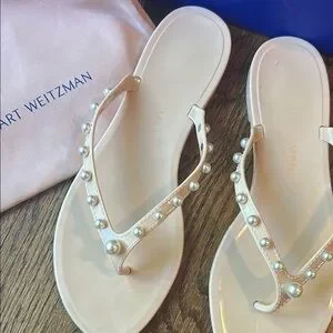 Step into elegance with these Stuart Weitzman sandals, showcasing a sophisticated cream hue and adorned with pearl-like beads. The flat footbed and polished finish make them ideal for both beach outings and casual summer events. Preowned- wear includes fading of brand name on soles.