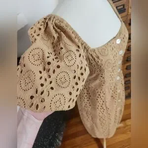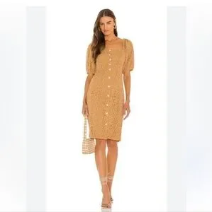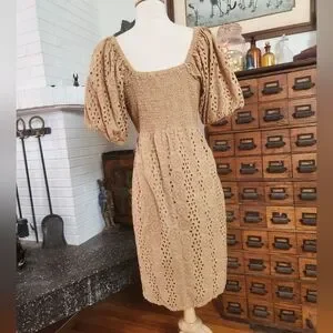 Demi Eyelet dress, with smocked back that allows some flexibility, goegeous white shell buttons, fully functional buttons, can completely close, or leave some buttons open. Eyelet patterns, tailored waist, midi length, puff sleeves, sleeves are unlined, dress is lined. Square neckline, square back with elastic band and sleeves, dress can be worn on sleeves, or dangling off, elasticized cuffs. Eco-Concious company ❤️ dress is in great condition. The dress is a warm, toned tan orange. It's such a great summer dress, perfect for summer parties, date nights, vacations, daytime events