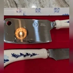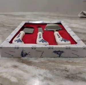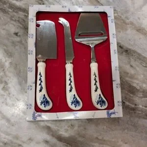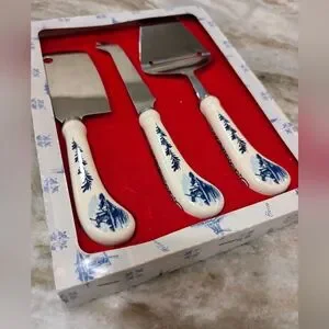 This vintage cheese knife set is a rare find for collectors of Delft Blue and White kitchenware. Made by Elesva with durable stainless steel, this server is perfect for slicing and serving a variety of cheeses. The intricate blue and white design adds a touch of elegance to any table setting. Ideal for use or display, this piece is a must-have for any kitchen or collection. In Excellent Condition. Photos are part of the description. Hand painted still in original box!