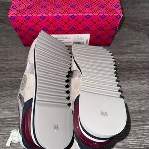 Stylish Tory Burch sneakers. With a grey in grey fabric and mesh style with accent colors featuring white, Navy Blue and Burgundy.